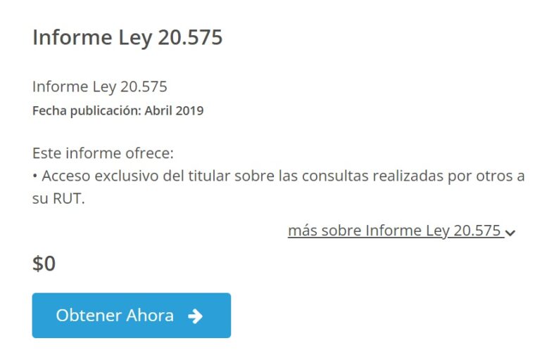 Otra opción es acceder a la propia plataforma de Equifax, “Comprar Online”. y selecciona la opción “Ver todos los productos…”, luego vaya al final de la lista de informes disponibles y haga clic en “Obtener informe ley 20 575”.